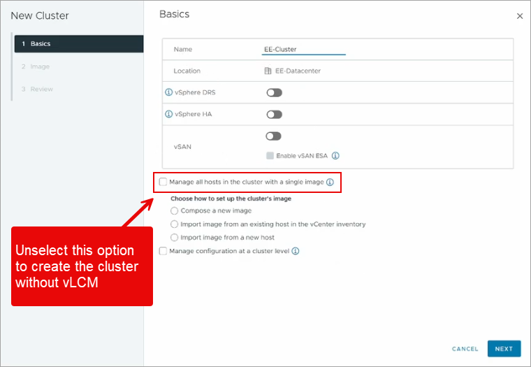 - Create a new cluster where vLCM isn’t enabled before installing JetStream DR software.