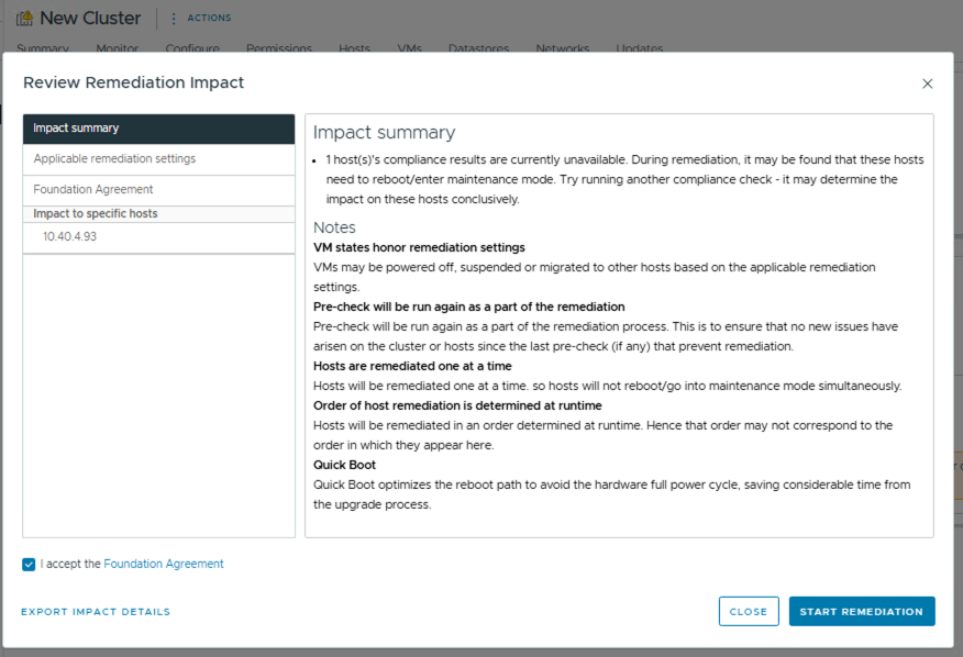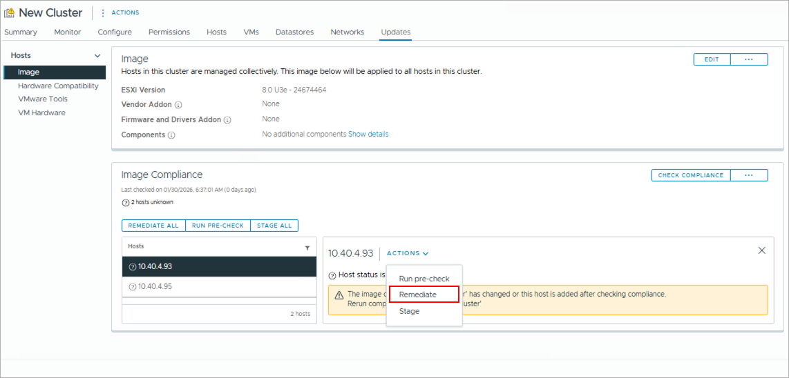 - Repeat the Remediate the Cluster step above to perform an additional remediation picking up any hosts that were still out of compliance with the image.
