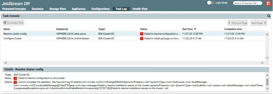 If vLCM is enabled when the cluster is created, configuration of JetStream DR software on that cluster can fail with the below error condition. Although the JetStream DR IO Filter will be added to the vLCM-enabled cluster during configuration, it cannot be applied to the base image until after a host remediation process has been completed or JetStream DR hosts have been moved to a non-vLCM configured cluster.