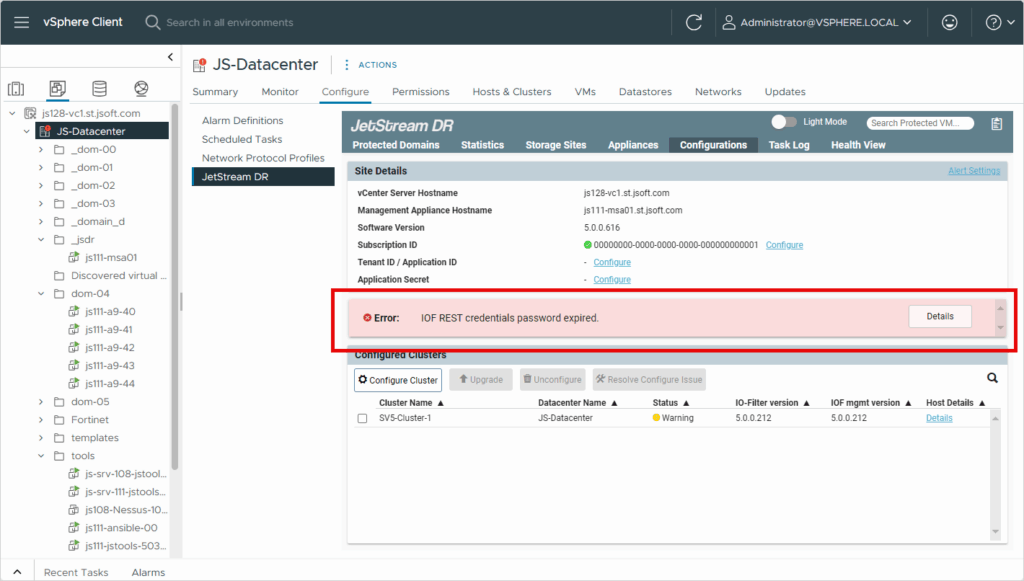 - Execute the following run-command from your Azure portal → AVS private cloud → Operations → Run commands → JSDR configuration (latest one): Enable-JetStreamRESTUser