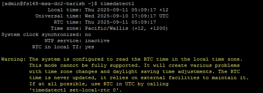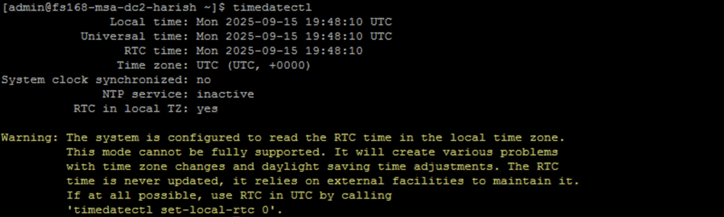 - Execute the command timedatectl on the MSA console/SSH: