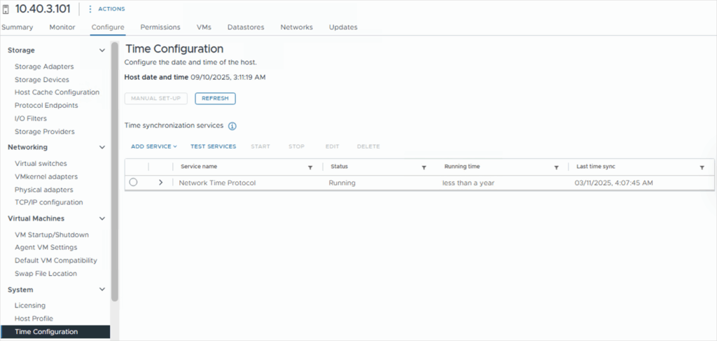 - In the left navigation panel go to System → Time Configuration and view the current host time on the Time Configuration screen.