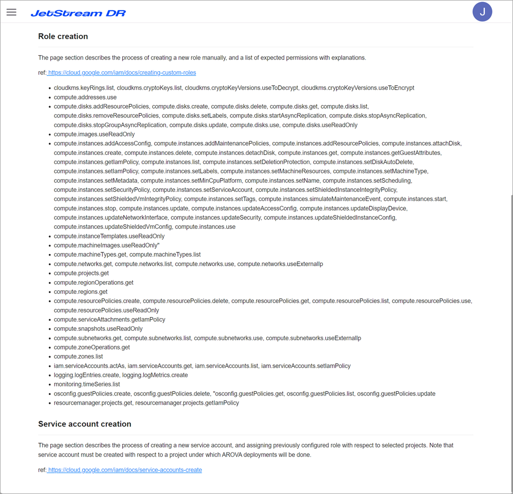 The lower half of the Preparation Helper includes information about Google Cloud Shell commands with details for manually creating roles and a service account to operate AROVA appliances.