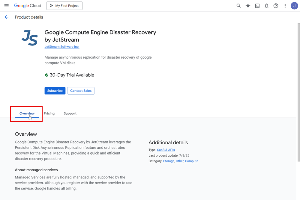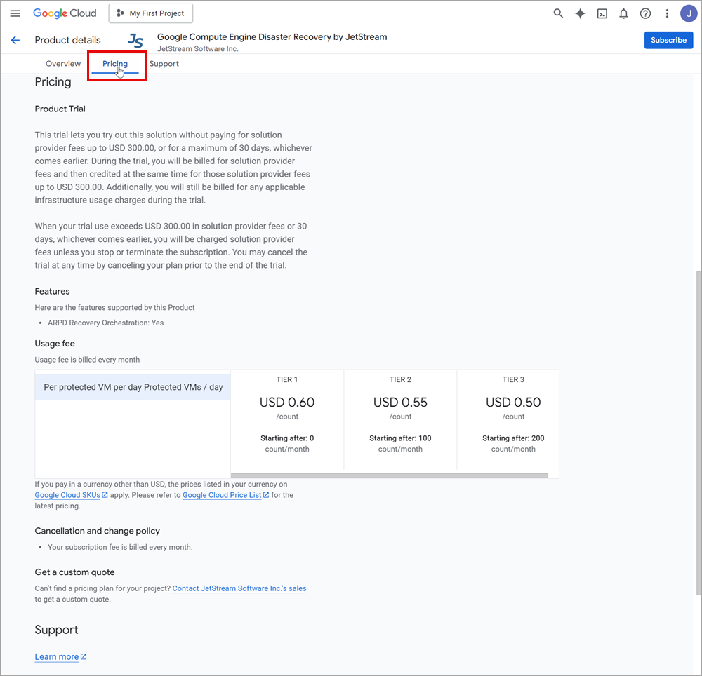 - A free 30-day trial is automatically granted the first time you subscribe to Google Compute Engine Disaster Recovery by JetStream. It allows you to use the product free of charge during the first 30 days up to a value of USD $300.