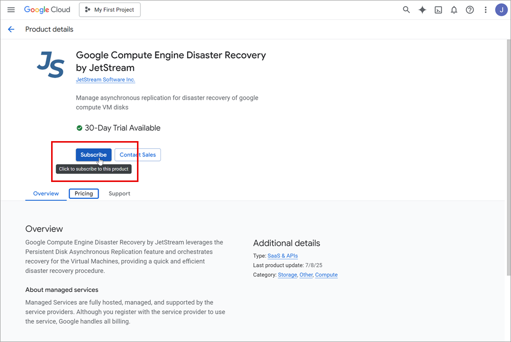 Google Cloud Marketplace Subscribe to the Software Scroll back to the top of the Product details screen. Click the Subscribe button to start a subscription to the software. Figure 10: Click the Subscribe button.