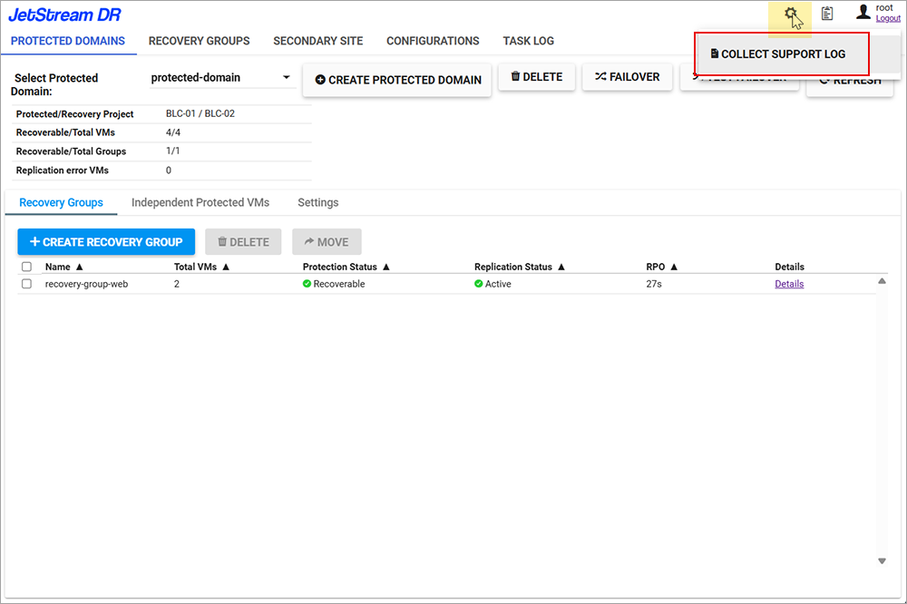 - From the AROVA UI, click the gear icon in the top-right corner and select the COLLECT SUPPORT LOG option from the menu.