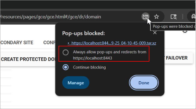 Note: If your browser blocks pop-ups, the support log bundle will not automatically download. To remedy this, click the "pop-up blocked" icon in the browser address bar to allow the file to download.