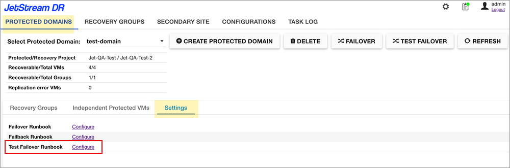 The Test Failover Runbook defines the steps and settings used to validate your disaster recovery configuration without impacting production workloads. It allows you to bring up VMs in an isolated environment, following the specified boot sequence, network settings, and property configurations.