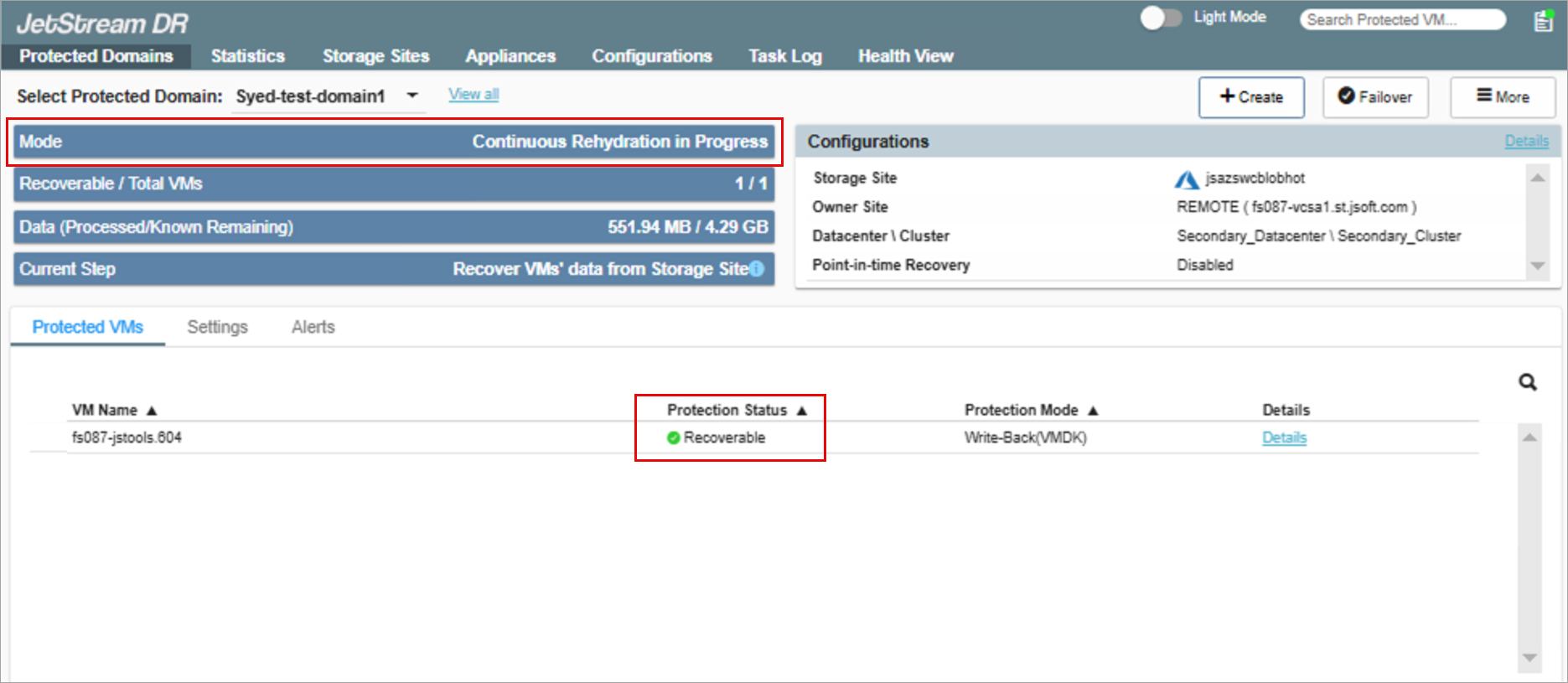 - After the continuous failover has been configured and started, data will be continuously rehydrated from the object store to the recovery site. VMs can be immediately operated normally at the protected site. Eventually, the operating mode will indicate “Continuous Rehydration in Progress” and the protection status of VMs will become “Recoverable.”