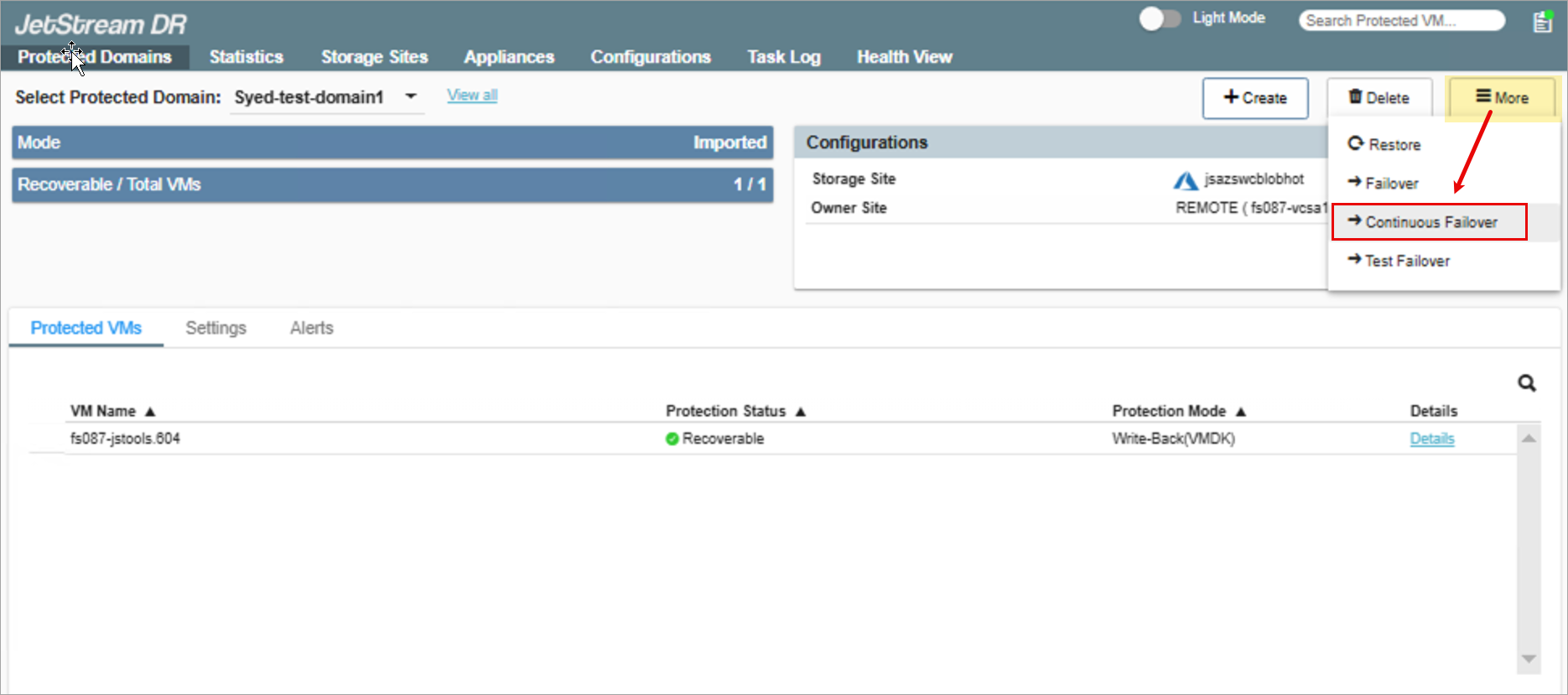 From the recovery site, select the Continuous Failover option to begin configuring it.