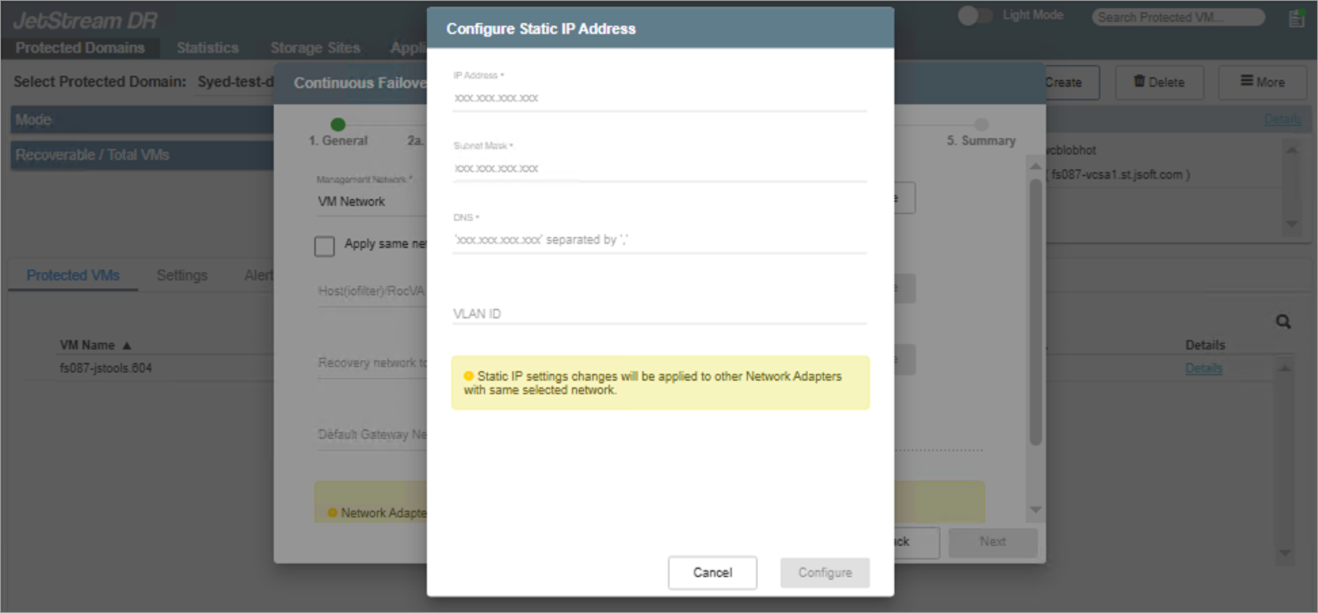 - Select a network and enable its Static IP check box. A pop-up window will appear allowing static IP values to be specified.
