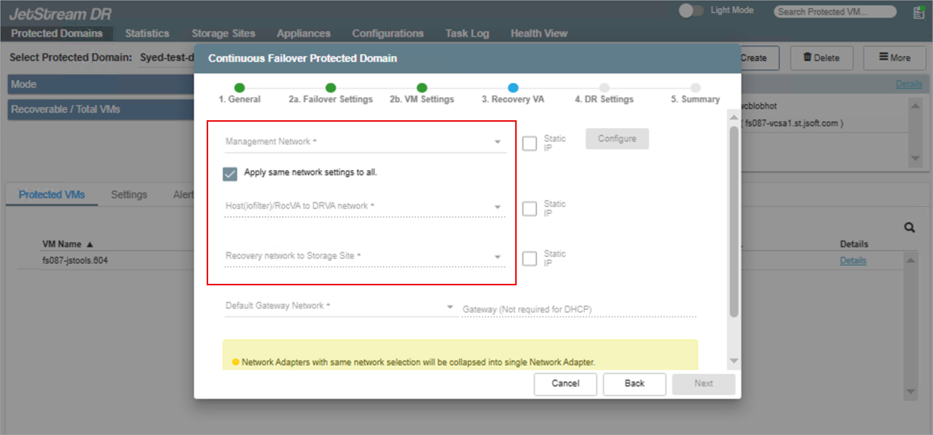 - If different networks will be used for the Host I/O filter RocVA to DRVA network and the RocVA to object store network, de-select the checkbox option "Apply same network settings to all."