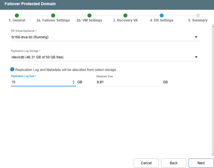 - Select the DR Virtual Appliance and Replication Log Storage from the menus.