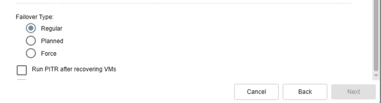- Regular Failover: Regular failover is used in response to a disaster event where data must be fully recovered to the recovery site, DR storage policies applied, protection of the domain resumed, VMs powered on, temporary VMs cleaned, ownership shifted to the recovery site, etc.