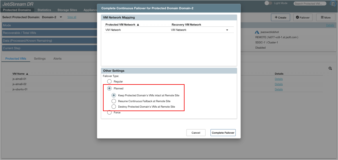 Multiple options are available to control the state of the protected site and ownership of VMs and data after failover has been completed. Failover can be completed in one of three ways: Regular, Planned, or Forced.