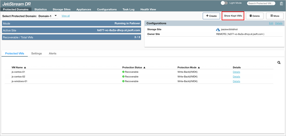 - If the Keep Protected Domain's VMs and section intact at Remote Site option is selected, click the Show Kept VMs button on the Protected Domains screen to view a list of all VMs that were preserved at the remote site.