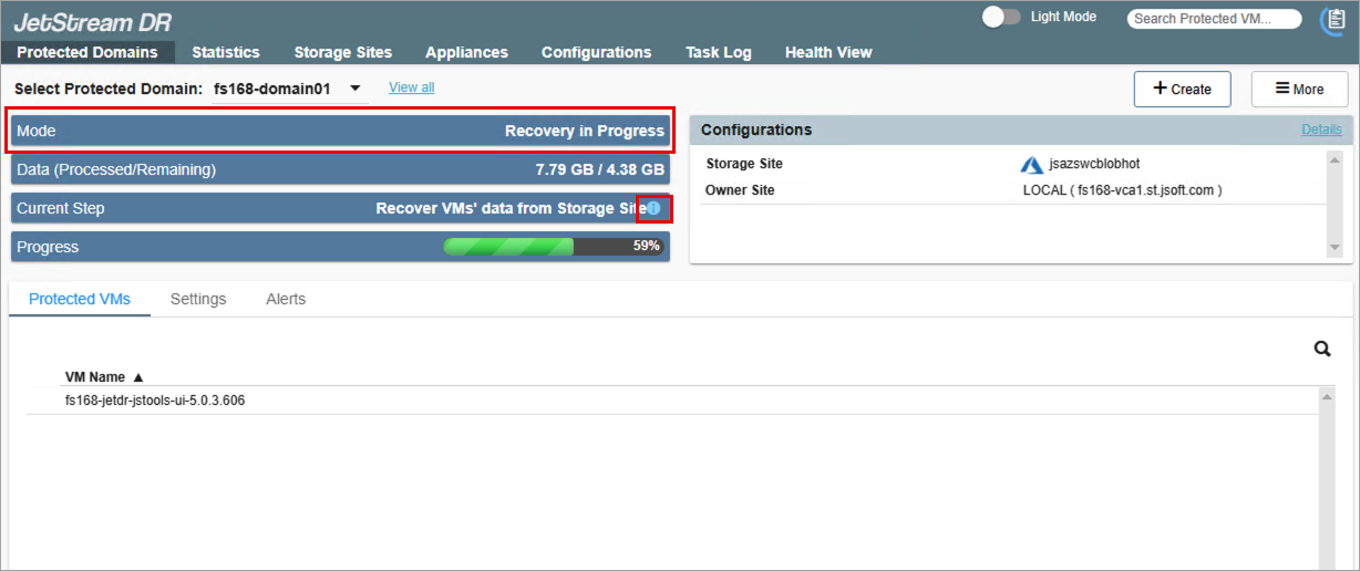 - The restore process will begin and the mode of the Protected Domain will change to “Recovery in Progress.”