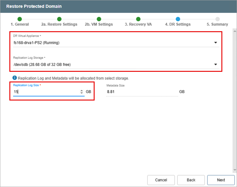 - Specify a Replication Log Size. (Note: Metatdata Size is not directly editable. It is derived from the Total estimated data size to be protected specified when the Protected Domain was configured – it can also be adjusted from the General step, above.)