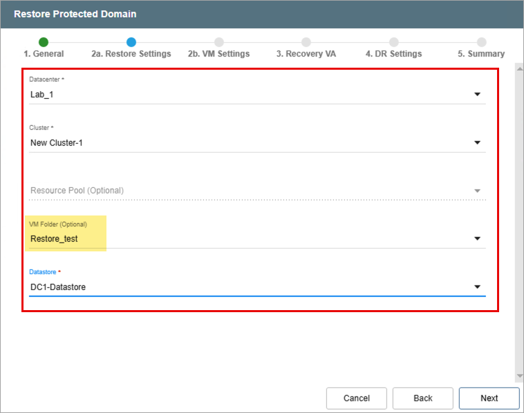 - Make selections from the drop-down menus to specify recovery settings for the primary site, including: Datacenter, Cluster, Resource Pool, VM Folder, and Datastore.