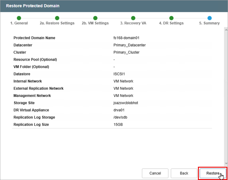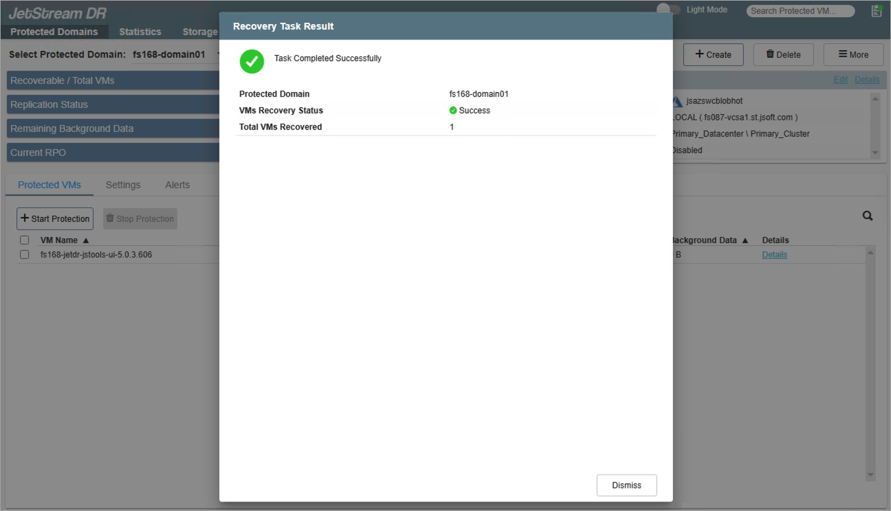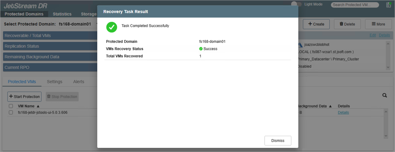 - When the task is complete the restored VMs from the Domain will be fully operational and their status will be “recoverable” and they will continue to be protected.