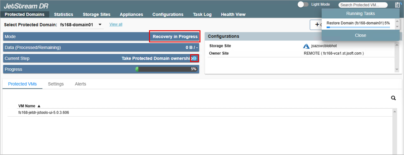 - The restore process will begin and the mode of the Protected Domain will change to “Recovery in Progress.”