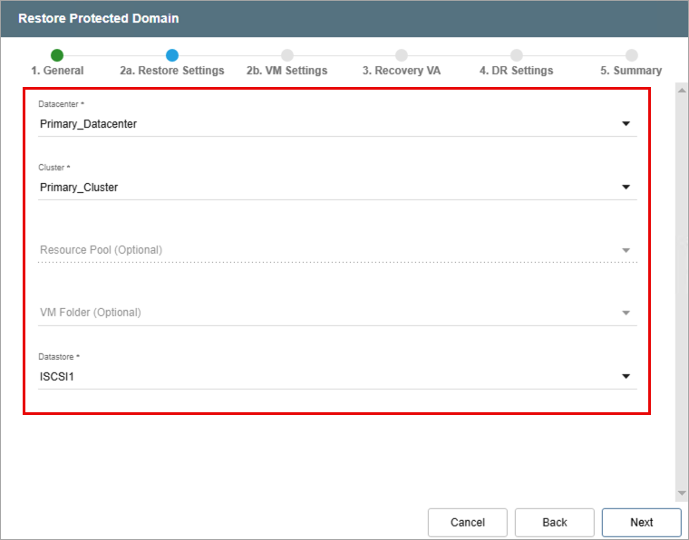 - Make selections from the drop-down menus to specify recovery settings for the remote site, including: Datacenter, Cluster, Resource Pool, VM Folder, and Datastore.