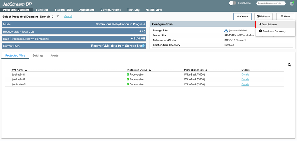 To verify proper operation of failover and the infrastructure, "test failover" can be performed to observe recovery of virtual machines and their data from the object store to a test recovery environment.