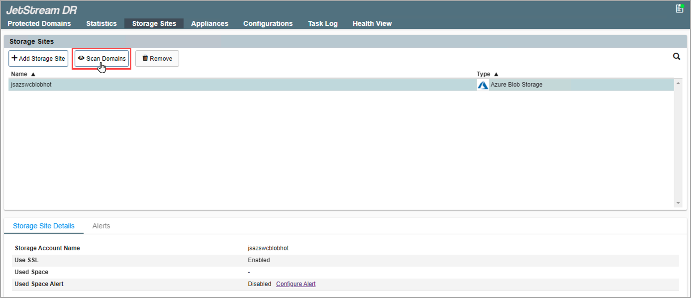 - On the Storage Sites screen, click the Scan Domains button then import the Protected Domain to test.