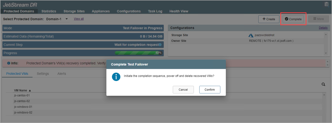 - After VMs and data have been tested and the outcome of the test failover is deemed successful, confirm completion then click the Complete button to finish up.
