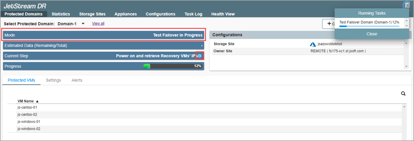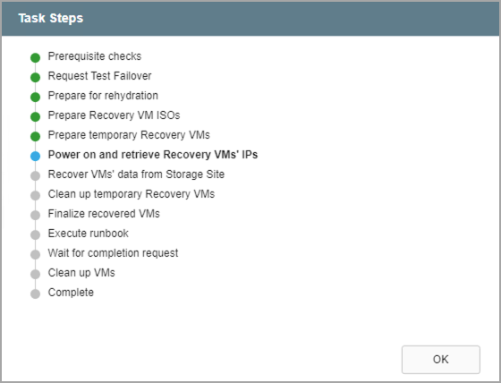 - Click the blue info icon in the Current Step field (refer to above) to view details of each failover task as it is performed during the test failover.