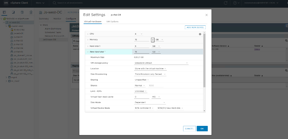 Virtual disks can be added to or removed from protected VMs at any time using the standard vSphere user interface.