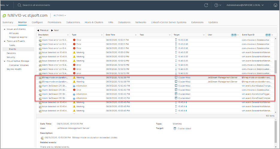 Figure 44: Example of alerts recorded by vCenter.