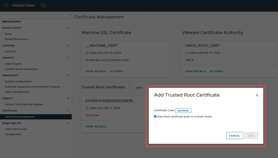 - From the vSphere client, go to Menu > Administration > Certificate Management > Trusted root certificates and add each necessary certificate.