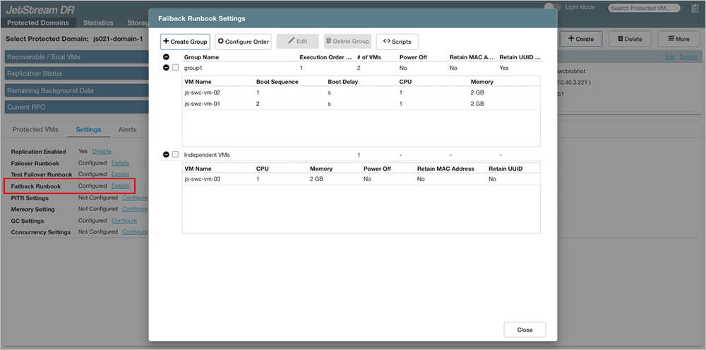 A failback runbook is a set of configuration and default settings that are applied to protected VMs of a Protected Domain when it is failed back to the protected site. The Failback Runbook Settings dialog window appears when the Failback Runbook Details link is clicked. Additional information about configuring a failback runbook is provided under the section Failover/Failback Runbooks.