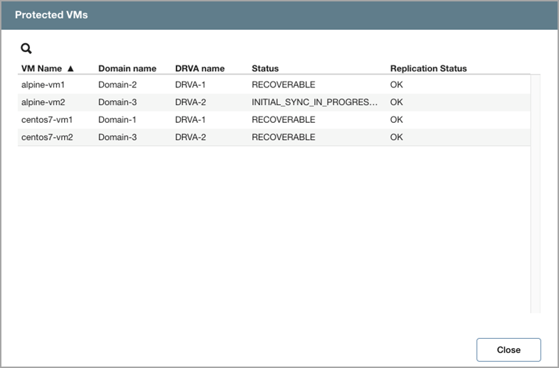 - Clicking one of the links will open a pop-up window displaying details about the VMs, their status, and associated Protected Domains and DRVAs.