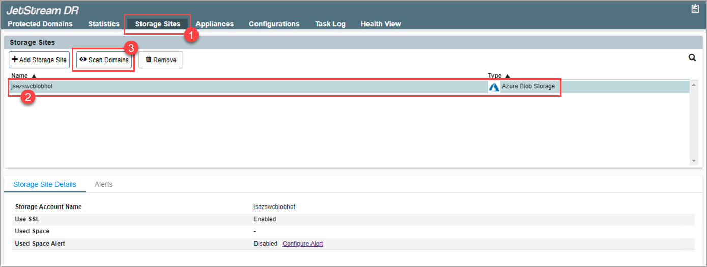 - On the Storage Sites screen, select the object store where the data was protected then click the Scan Domains button.