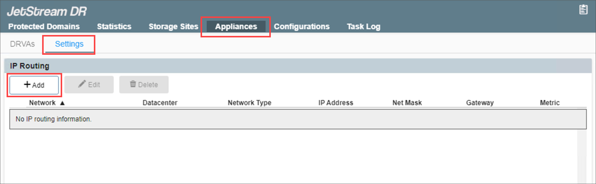 To avoid network communication issues, additional entries can be added to the route table to create unique routing paths. The additional routing information can be specified in JetStream DR from the Appliances > Settings screen. Once additional IP routing information has been configured in the MSA, any appliance deployed after that should contain the necessary routing information to operate properly.