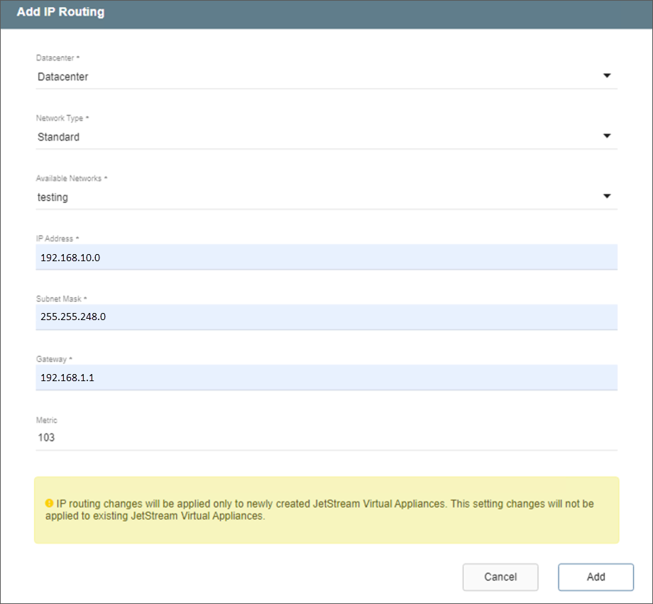 Note: IP routing will only be applied to new JetStream appliances created after the point in time when the information is entered.