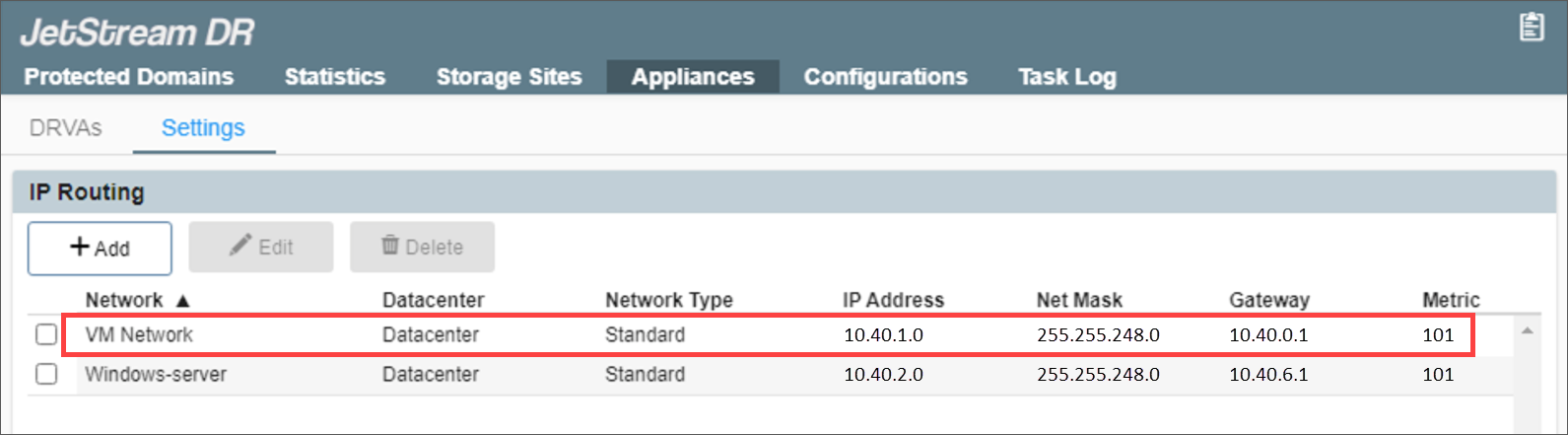 - The new IP routing information will now appear on the list and will be used by all JetStream DR appliances subsequently created.