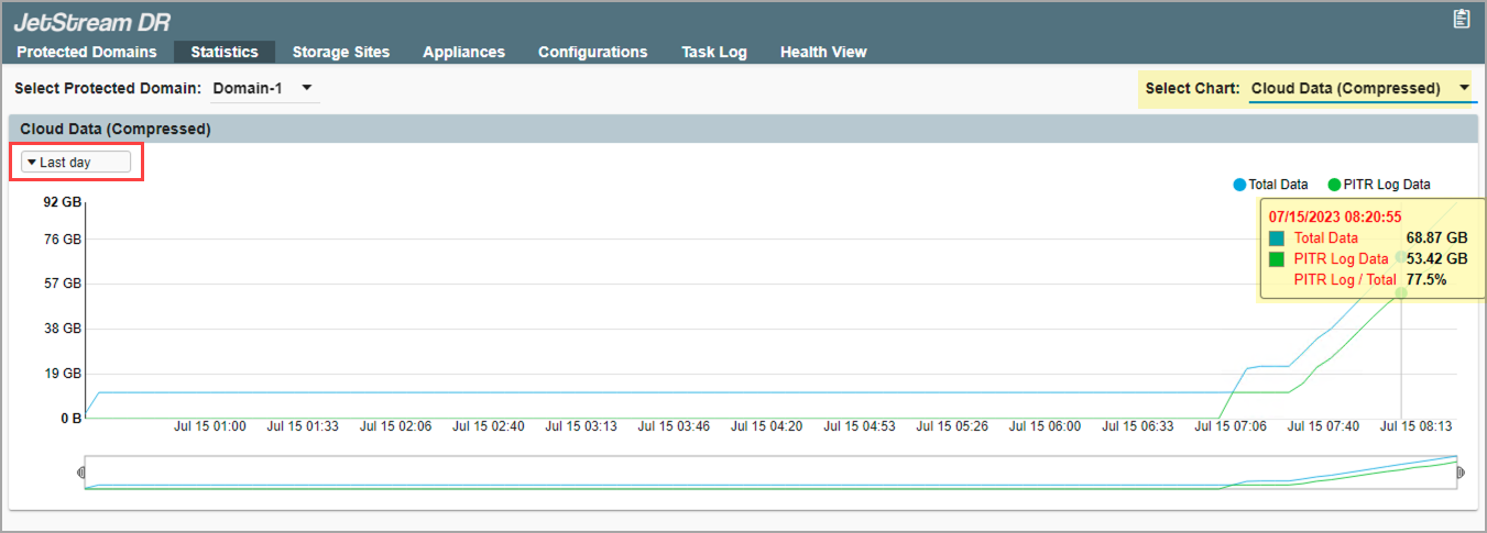 • Highlighting a point on the graph displays data from that specific point in time about compressed Total Data and PITR Log Data in the cloud.