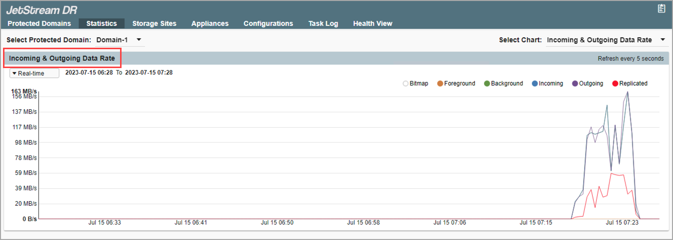 Data is replicated from the protected site to the object store as a continuous, ongoing process. When a VM’s protection status becomes "Recoverable," new data written by the VM to primary storage will also automatically be replicated to the object store for protection. This process can be observed from the Incoming and Outgoing Data Rate report from the Statistics screen.