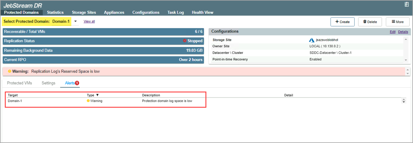 - An alert message is triggered indicating a problem with the Domain log space of Domain-1.
