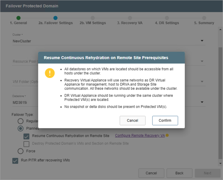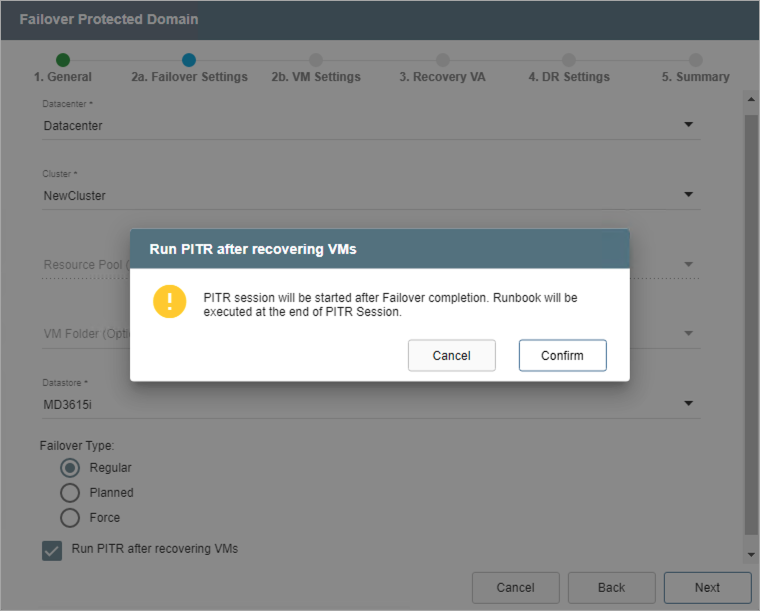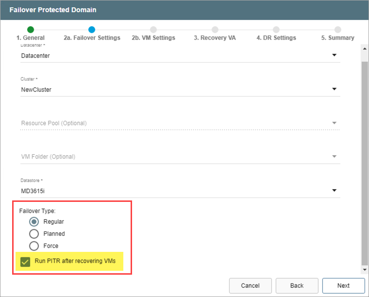 - On Step 2a (Failover Settings) specify a failover type and select the Run PITR after recovering VMs option.