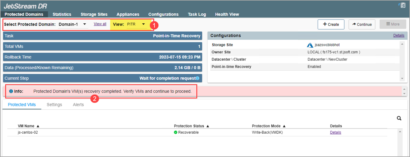 - From the Select Protected Domain menu at the top of the screen, set the View to PITR to see the list of PITR recoverable VMs (1).