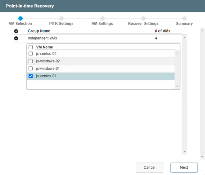 Note: Only VMs that were originally included in the PITR Protected Domain will appear in the selection lists.