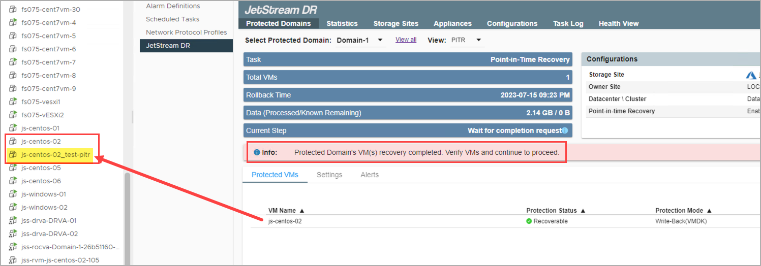 - An alert message (2) will indicate the VMs of the Domain have been recovered and can be tested to check their content.