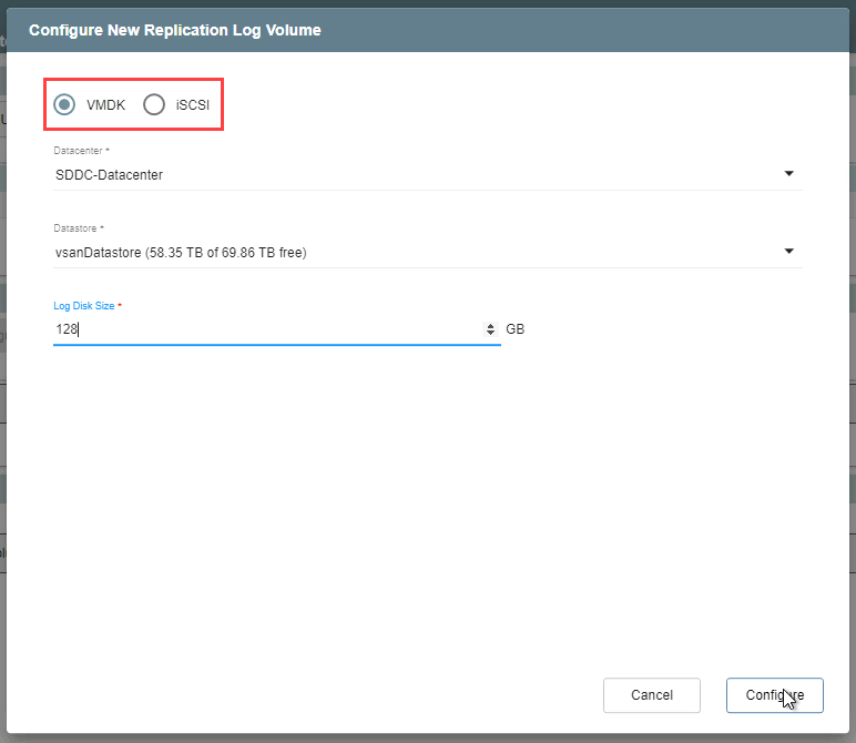 - In the pop-up dialog window, choose the type of storage to be used for the replication log volume.