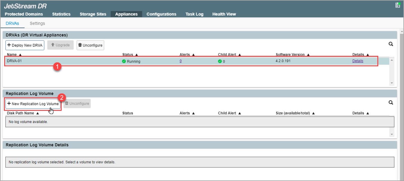 - With a DRVA selected, click the New Replication Log Volume button.