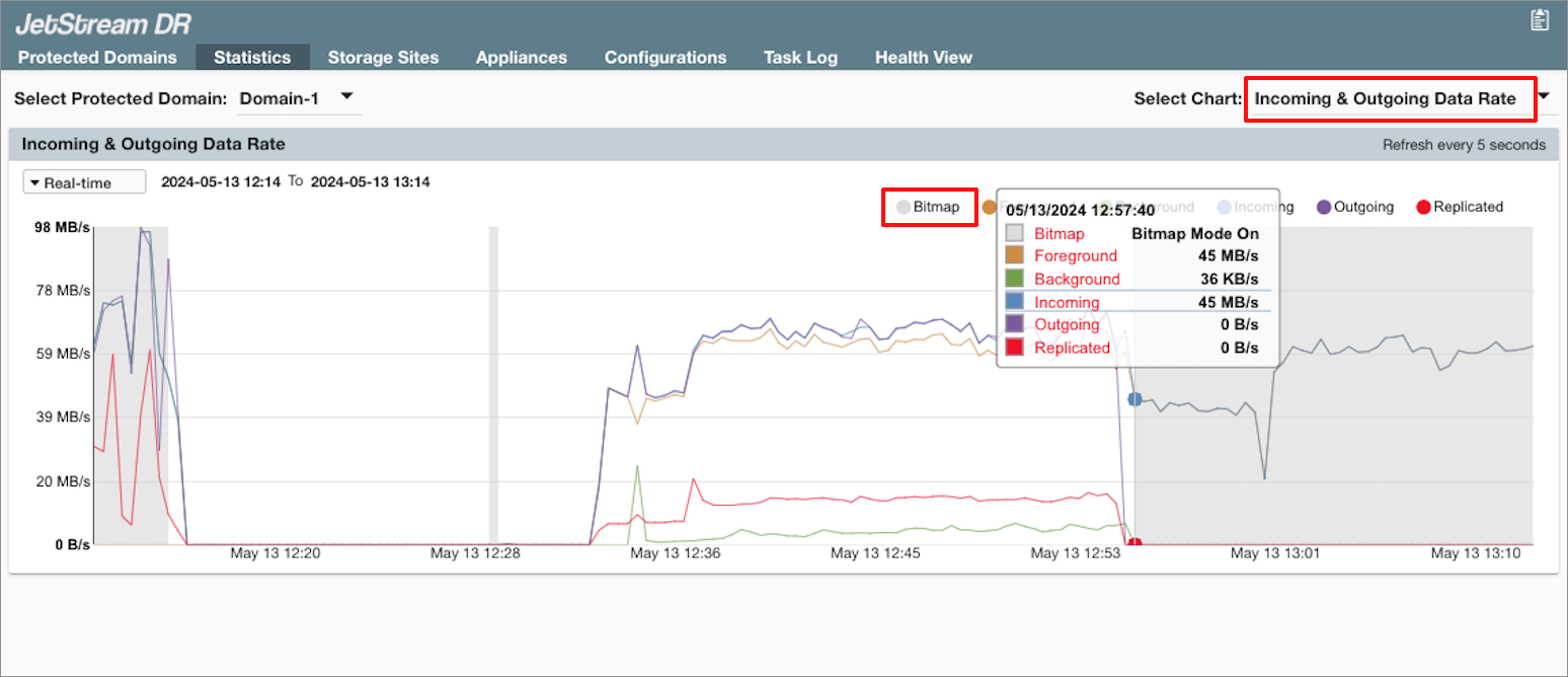 - The Incoming & Outgoing Data Rate from the Statistics screen shows time spans when the Domain was running in bitmap mode. To highlight periods on the graph when bitmap mode was engaged, click the Bitmap circle icon at the top of the chart.