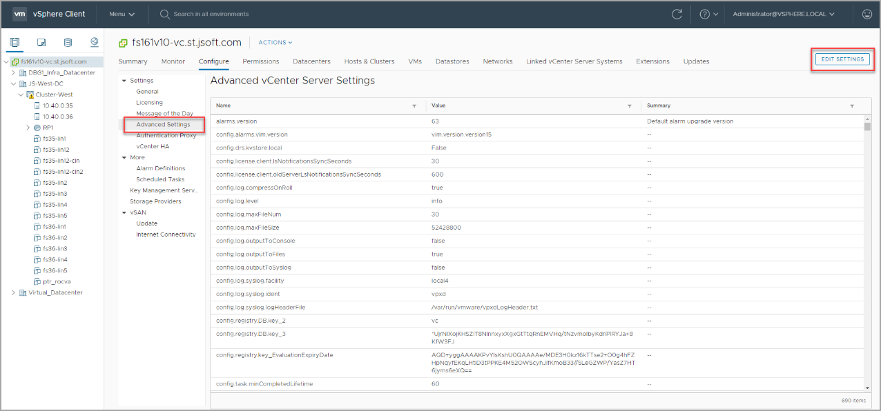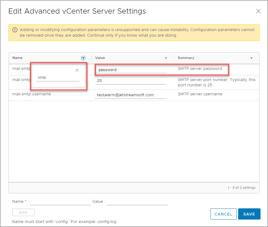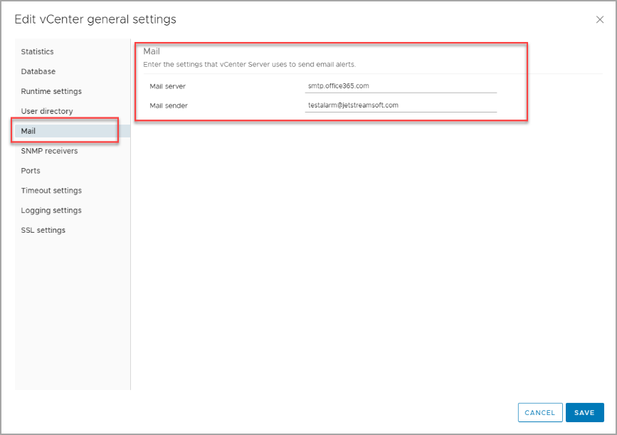 Figure 38: Configure the SMTP sender in vSphere.